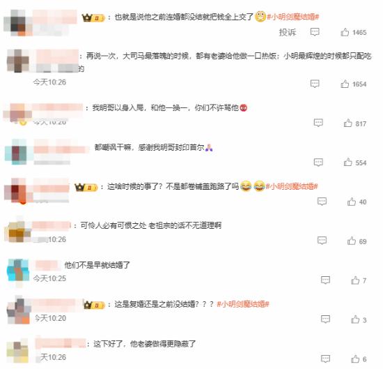 今日,#小明剑魔结婚#登上微博热搜,引发网友热议。网友纷纷送上“祝福”。高赞评论:再说一次,大司马最落魄的时候,都有老婆给他做一口热饭;小明最辉煌的时候都只配吃外卖,还是冷的。