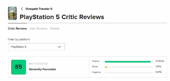 《八方旅人0》口碑已解禁,M站媒体均分85。其中21媒体给出好评,1家媒体给出中评,0家媒体给出差评。