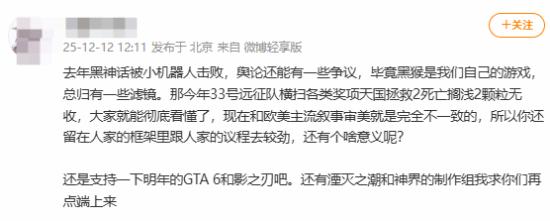 随后,《黑神话:悟空》却引发国内玩家的热议。有玩家在社交平台指出:去年《黑神话》虽拿奖但未获年度游戏,今年《光与影:33 号远征队》作为独立游戏横扫奖项。也有玩家认为,从颁奖可以看出,黑神话那年明显被歧视,老外欣赏不来 。