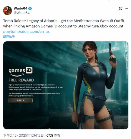 官网显示,注册Amazon Games iD帐户并将其关联到自己的Steam、PlayStation Network或Xbox帐户即可获得专属地中海潜水服套装。《古墓丽影:亚特兰蒂斯遗迹》发布后,地中海潜水服套装也将在游戏内推出。