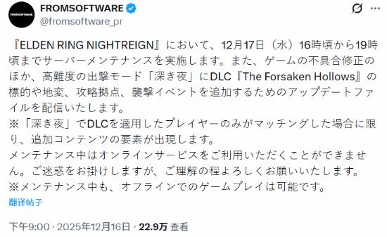 今晚,《艾尔登法环:黑夜君临》官方发布服务器维护公告,除了修复游戏问题外,还有深夜模式新增内容。