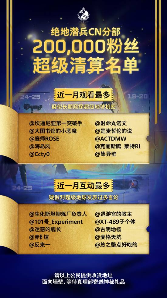 今日,游戏《绝地潜兵》品牌B站账户为庆祝粉丝量突破20万,在B站公布了一份“清算名单”。