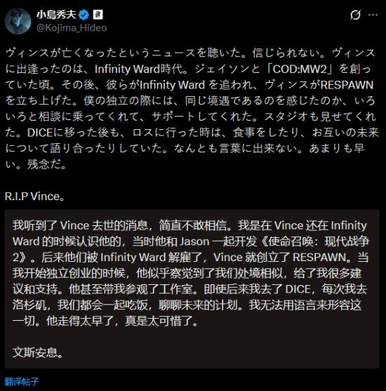 业界知名游戏制作人小岛秀夫也发文为其悼念,小岛秀夫表示: