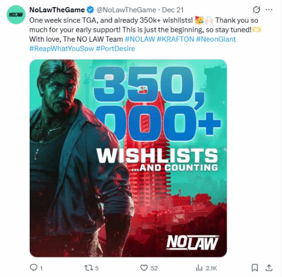 在2025年TGA颁奖典礼上惊艳亮相的3A开放世界生存游戏《NO LAW》,近日再传捷报:首曝首周,其Steam愿望单数量已突破30万,可见玩家对这款由《PUBG》发行商KRAFTON与瑞典知名工作室Neon Giant强强联手之作的高度期待。