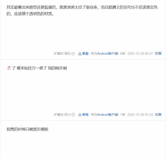 还有玩家指出,主角胳膊上的羽毛理应使用透明或半透明材质来提升质感,但实物却采用了厚重的实色涂装,视觉效果非常“拉胯”。