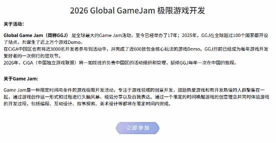 2026年CiGA中国独立游戏联盟即将迎来成立的第12年,从2015年1月23日的第一场Global Game Jam起,CiGA连续12年组织GGJ中国区的的活动。Game Jam这一活动形式也从小众,到如今广泛被开发者所熟知。