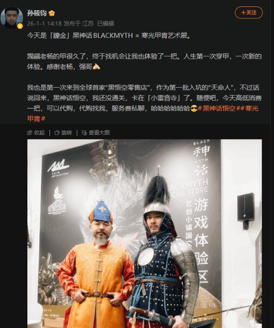 他写道:“今天是「鑠金」黑神话BLACKMYTH × 寒光甲胄艺术展。觊觎老杨的甲很久了,终于找机会让我也体验了一把。人生第一次穿甲,一次新的体验。我也是第一次来到全球首家“黑悟空零售店”,作为第一批入坑的“天命人”,不过话说回来,黑神话悟空,我还没通关,卡在「小雷音寺」了。”