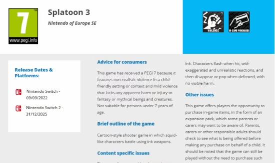 IT之家1月4日消息,欧洲游戏分级组织(PEGI)官网显示,任天堂人气射击游戏《喷射战士3》,以及即时战略游戏《皮克敏 3豪华版》已在欧洲获得Nintendo Switch2版本的评级认证。