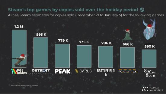 毫无悬念,《Arc Raiders》是Steam此次刷新历史纪录的主力军。Alinea Analytics的数据显示,这款游戏在该平台销量突破120万份,稳居假日季销量榜首。