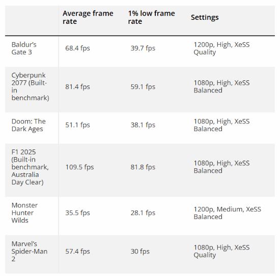 测试使用了1080p或1200p分辨率,并开启了XeSS技术,没有使用帧生成,多款3A大作均表现出色: