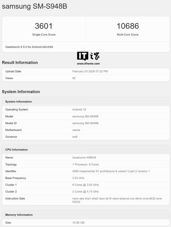 IT之家 2 月 5 日消息,科技媒体 Notebook Check 昨日(2 月 4 日)发布博文,报道称三星 Galaxy S26 Ultra 手机现身 GeekBench 跑分库,6.5.0 版本单核成绩为 3601 分,多核成绩为 10686 分。