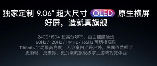 产品独家定制 9.06 英寸超大尺寸 OLED 原生横屏,分辨率达到 2400×1504,并支持 60Hz、120Hz、144Hz 及 165Hz 多档可切换高刷新率,满足不同游戏与应用场景需求。屏幕具备最高 1155nits 全局亮度表现,并支持 5280Hz PWM 调光与 100% DCI-P3 色域覆盖。