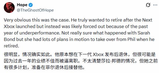 知名的可靠消息人士Ghost of Hope发文爆料称,斯宾塞确实计划过退休,但那也要等到下一代Xbox退休之后,而原本的Xbox总裁莎拉·邦德计划接替他的岗位。分析指出,由于微软游戏业务在去年表现不佳,斯宾塞被迫提前离开CEO岗位。