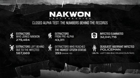 本次封闭Alpha测试共有279,484名探索员参与,其中43,311名为曾参与过Pre-Alpha测试的老玩家,他们再一次踏入了《纳克园》的世界。在5天的时间里,玩家们总共击杀了高达32,041,716名感染者,平均每位探索员击杀了115名感染者。