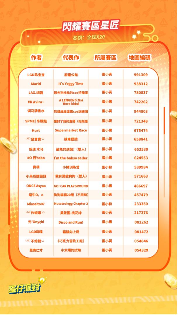 與優秀創作者共同合作,打造更好的遊戲環境《蛋仔派對》於今年暑假所舉辦「蛋仔派對-全球樂園工坊大賽」,玩家可以透過遊戲中的「樂園」功能,將自己腦中的創意打造成遊戲中的地圖,讓全體玩家進行遊玩、投票再加上官方評審後的綜合評比,選出最終的獲獎玩家。本次大賽中共決勝出超級工坊巨匠 1 位、閃耀賽區星匠 20 位、工坊潛力新星 20 位、社群推薦王 20 位、人氣地圖排行榜 200 位,其中「超級工坊巨匠」與「閃耀賽區星匠」更有機會獲得官方簽約,成為官方創作者獲得更多豐富獎勵。