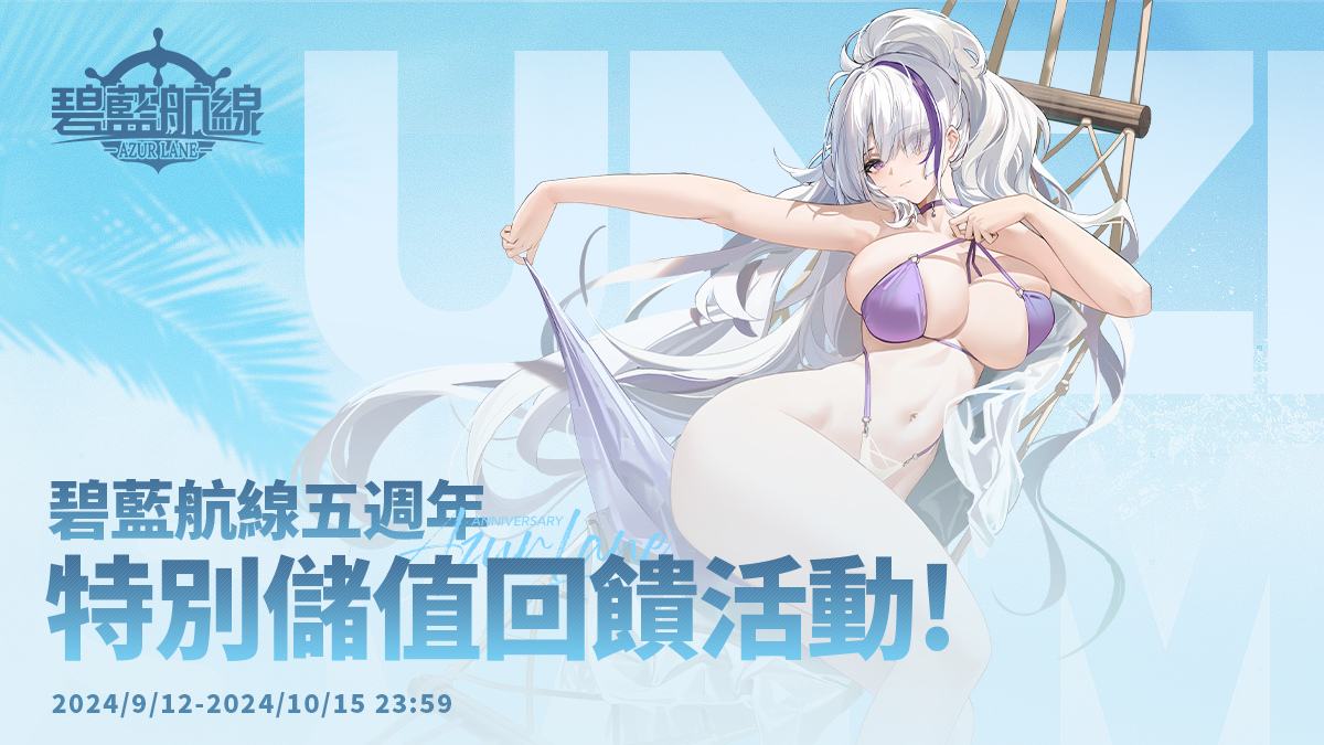 .《碧藍航線》×「一風堂」聯名活動時間:2024 年 9 月 16 日(一)至 10 月 14 日(一).活動方式:於活動期間內至一風堂全臺門市購買聯名套餐,即可獲得一張虛寶卡及一份紀念周邊(數量有限,送完為止).聯名套餐內容(限內用):A. 《碧藍航線》奢華獨享餐(台北大巨蛋店限定)售價:560元套餐內容:拉麵 2 選 1(大名家系豚骨/柚香鹽味拉麵)、開胃小菜(胡麻拌時蔬、美味炸物:香酥脆雞軟骨)、飲品 8 選 1(可爾必思蘇打系列/冰紅茶/無糖綠茶)B. 《碧藍航線》專屬獨享餐(中山本店限定)售價:450元套餐內容:拉麵 1 碗(大名家系豚骨)、開胃小菜(涼拌時蔬)、飽腹料理(重奶油馬鈴薯)、飲料 3 選 1(冰紅茶/無糖綠茶/可樂)C. 《碧藍航線》專屬獨享餐(其他一般門市)售價:450元套餐內容:拉麵 1 碗(大名家系豚骨)、開胃小菜(芝麻小黃瓜)、飽腹料理(一風堂絕品薯條(原味))、飲料 3 選 1(冰紅茶/無糖綠茶/可樂).虛寶卡內容:物資×1,000、聯動家俱「一風堂拉麵碗」×1(將於活動結束後,於遊戲內信箱發放給兌換過本卡之指揮官).虛寶卡兌換期限:2024 年 12 月 14 日 23:59:59(每個 UID 限兌换一組序號,每組序號限使用一次)為歡慶《碧藍航線》首次與一風堂聯名,官方也將於 9 月 21 日(六)舉辦聯動紀念主題日,活動現場將邀請多位嘉賓 Coser 們現身與指揮官們進行互動小遊戲與合影!.《碧藍航線》×「一風堂」主題日時間:2024 年 9 月 21 日(六)11:00~14:00.活動地點:一風堂 台北大巨蛋店(台北市信義區忠孝東路四段515號).活動內容:嘉賓 Coser 將快閃台北大巨蛋店,與指揮官進行互動小遊戲並合影!.出席嘉賓:佐歌奈、紫玥桃、小泱※主題日活動當日適逢球場賽事人潮眾多,建議先行透過 inline 線上訂位並標註「碧藍航線活動」減少現場等候時間。五週年限定 Mycard 儲值回饋開啟!達指定額度還可額外領取虛寶!遊戲內也少不了五週年慶祝活動,為回饋指揮官們長久以來的支持,官方推出 MyCard 特別儲值回饋活動!活動期間內除了儲值達到指定額度將或得虛寶外,更可抽限量周邊「墨韻雙華 應瑞肇和 雙角色立牌」,請指揮官們千萬別錯過這麼划算的機會囉!
