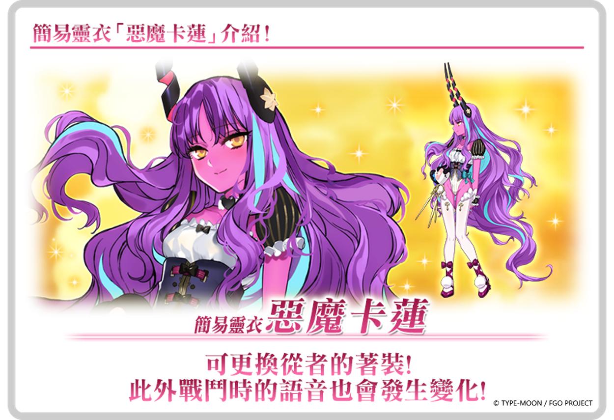 善用「聖人的祈禱 EX」提升戰鬥力,簡易靈衣「惡魔卡蓮」登場在本次活動中,使用全新巧克力「祝福鎖定巧克力〔草莓〕」和「祝福鎖定巧克力〔藍莓〕」,可兌換賦予中意的從者活動限定的特效技能「聖人的祈禱 EX」,將在戰門開始時自身的 NP Charge 至最大值,以及自身的羈絆點數獲得數量提升 50%!