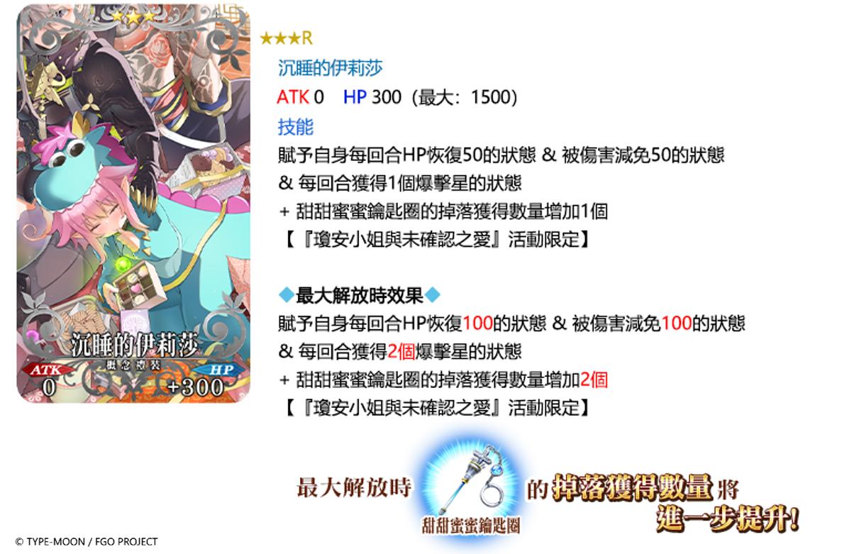 同期間登場的還有「★5(SSR)春日之風」、「★4(SR)愛之妄想」及「★3(R)沉醉的伊莉莎」等三款限時概念禮裝。裝備限時概念禮裝通關本次活動,不僅賦予既有的增益效果,還能有效提升「甜甜蜜蜜硬幣」、「甜甜蜜蜜三角旗」、「甜甜蜜蜜鑰匙圈」等活動道具掉落數量。1 / 3