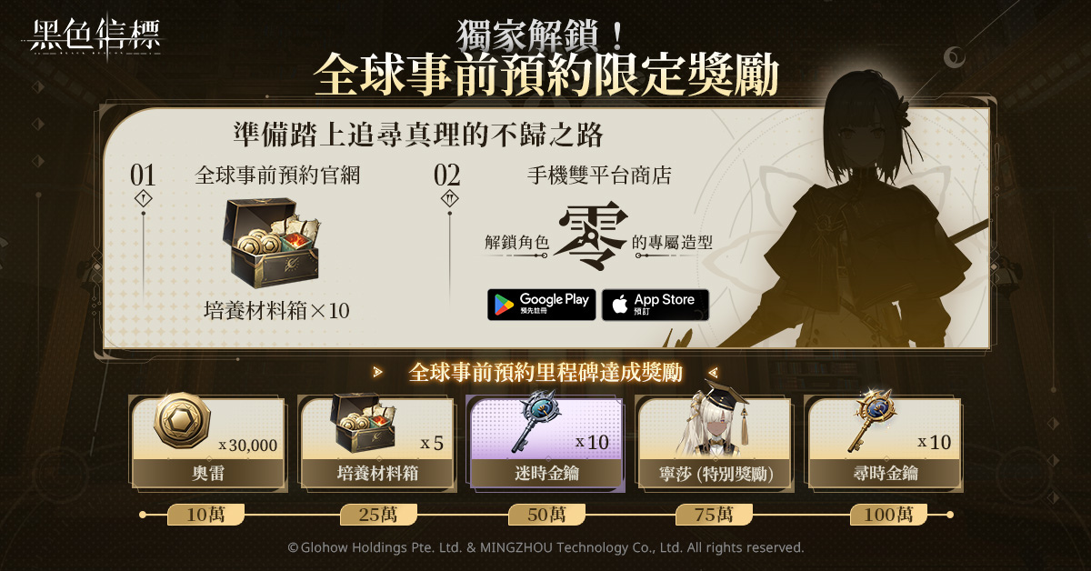 【以下內容皆來自廠商提供新聞稿資料】自今日起,全球玩家(涵蓋北美、歐洲及亞洲地區,不含中國、韓國及日本)皆可透過《黑色信標》官方網站及 Google Play 商店進行事前預約。而 Apple App Store 的事前預約功能也預計於近期開放,請玩家敬請期待。緊接著今日的事前預約開放後,《黑色信標》的「預見者試煉」(GBT)也將於 2025 年 1 月 8 日正式揭開序幕!這是玩家在全球上市之前,首次探索這個獨特宇宙並搶先體驗遊戲玩法的寶貴機會。請千萬不要錯過加入這場史詩探索之旅的最佳時機!一段革命性冒險旅程的展開!《黑色信標》設置於一個科幻與神話交融的迷人宇宙中,邀請玩家探索一個瀕臨混亂邊緣的反烏托邦世界。玩家將化身爲「異鄉人」(Outlander),成爲古老秘盟的一員,協力解開未知的秘密,在科技與被遺忘的傳說之間找到微妙的平衡。遊戲結合了打擊感十足的動作戰鬥、震撼的視覺美術以及沉浸感濃厚的敘事內容,帶領玩家展開探索信標謎團的旅程。「透過《黑色信標》,我們創造的不僅是一款遊戲,而是一個充滿神秘與冒險的宇宙。與 Glohow 的合作讓我們能將這個世界分享給全球玩家,邀請他們開啟屬於自己的真相探索之旅。」——Xi Liu,明晝網絡科技 CEO。「我們對於遊戲如何激發想像力並凝聚玩家感到無比興奮,而《黑色信標》真正體現了這種精神。其獨特的神話與科幻結合,帶來了改變性體驗,我們期待與全球玩家共同分享這段旅程。」——Jinny Kim,Glohow CEO。隨著全球事前預約的啟動,標誌著這款備受期待的遊戲將進入一個全新的階段。同時,官方也帶來了令人興奮的事前預約專屬獎勵和相關社群活動消息,期盼能爲自遊戲首度公開各大社群平台後,便展現對遊戲的高度熱情的全球玩家們的年末歡樂季節中增加一大亮點。事前預約專屬獎勵完成事前預約的玩家,將能解鎖特別的遊戲內道具和專屬內容作為獎勵:.全球事前預約官方網站:在遊戲上線時獲得培養材料箱×10.手機雙平台商店:解鎖角色「零」的專屬造型.全球事前預約里程碑達成獎勵:.10 萬名註冊:奧雷×30,000.25 萬名註冊:培養材料箱×5.50 萬名註冊:迷時金鑰×10.75 萬名註冊:寧莎(特別獎勵).100 萬名註冊:尋時金鑰×10一旦突破各里程碑且遊戲全球上線後,所有玩家都將獲得上述獎勵。