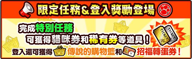 限定任務&登入獎勵活動舉辦中!「貓咪任務」中出現了以「貓咪購物節」活動為對象的特別任務!同時還有期間限定的登入獎勵!完成任務並每天登入遊戲,就可以獲得「稀有券」和「傳說的購物籃」喔!