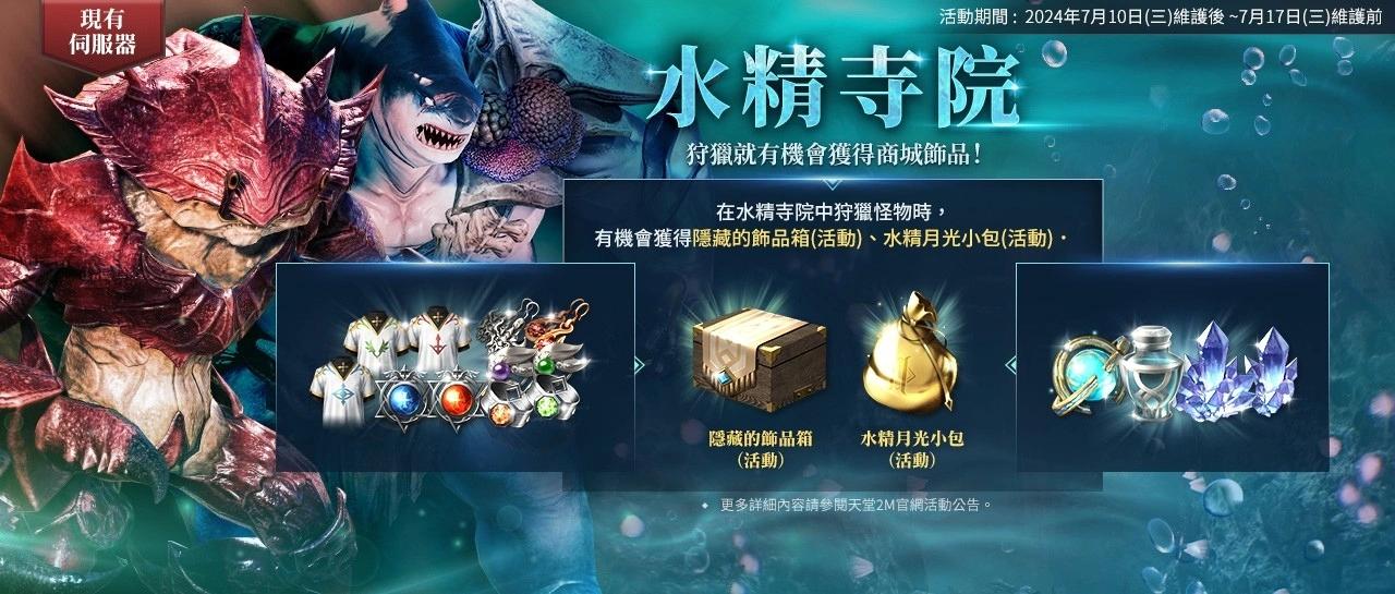 現有伺服器「水精寺院」:7 月 10 日維護後到 7 月 17 日維護前,活動期間內,在水精寺院中狩獵怪物時,有機會獲得「隱藏的飾品箱(活動)」、「水精月光小包(活動)」等獎勵道具。
