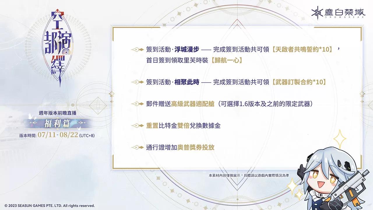 此外,分析員們呼聲極高的遊戲介面與基礎功能更新也一次性完成。除新增音樂鑑賞、畫冊典藏、攻略一覽等功能外,遊戲主介面還新增了全新「世界樹營地」場景,分析員們終於可以自定義遊戲主介面啦!週年福利超狂放送!登錄即領限定角色、時裝與武器自選!本次週年慶,《塵白禁域》製作組為分析員準備了超豐厚的限定福利,為感謝無論是一路以來與《塵白禁域》相伴前行或是近期剛加入《塵白禁域》的分析員們的厚愛,製作組也期待為每一位分析員帶來滿足又盡興的遊玩體驗。.新版本開啟後,將重置比特金雙倍兌換數據金活動.新版本期間,登錄即領全新時裝「里芙 - 歸航一心」.新版本期間,透過遊戲內郵箱贈送「天啟者共鳴誓約×10」,完成期間簽到還可額外獲得「天啟者共鳴誓約×10」.07/20 至版本結束,透過遊戲內郵箱贈送「高級武器適配艙」,玩家可自選 1.6 版本及以前的五星限定武器.07/25 至版本結束,登錄即領限定五星角色「芬妮 - 輝耀」及配套後勤.07/25 至版本結束,完成期間簽到領取「武器訂製合約×10」.07/11~07/17 及 07/25~07/31 期間,透過遊戲內郵箱每日領取「記憶嵌片補給包×4」及「巴德爾試劑(中)×3」1 / 4