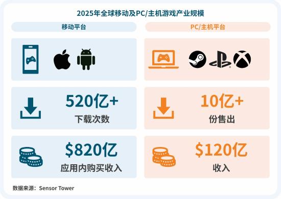 跨平台开发已成为游戏行业发展的核心驱动力之一。Sensor Tower 在其《2025跨平台游戏:连接移动设备与PC主机生态研究报告》中也指明了这一趋势。2025年的游戏市场,移动端以520亿次下载、820亿美元内购收入,成为新IP的核心入口,其全球规模无可比拟;而PC/主机端则以10亿份销量、超120亿美元收入,锚定高价值参与与品牌声望。移动端赢在规模,PC/主机端赢在单份收入。制胜之道,是让移动的“广漏斗”滋养高端生态——通过跨平台最大化整个IP的成长[12]。