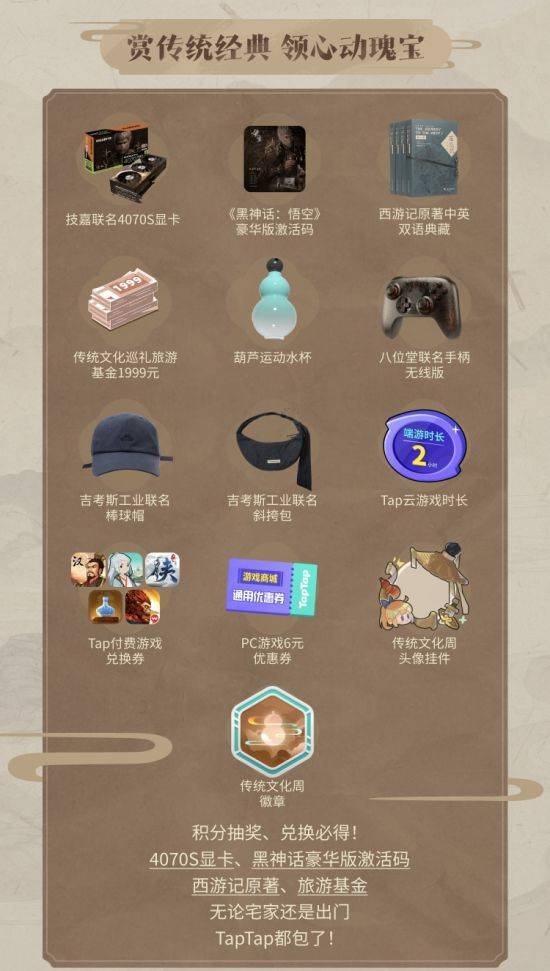 最后,TapTap还在纪录片播出期间举行了传统文化周活动。燕云十六声、文明6、匠木等40+款与传统文化深度结合的游戏正在集中展示。参与“TapTap传统文化周”活动,攒积分就能参与抽奖和兑换,有机会获得技嘉4070S黑悟空联名显卡、《黑神话:悟空》Steam 豪华版CDKey、1999元旅游基金、游戏优惠券、云游戏时长等海量奖品。活动还定制了 “传统文化周” 限定徽章与头像挂件供玩家兑换,在TapTap留下2024中国游戏的别样印记。