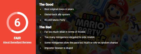 日前,GameSpot仅给《超级马里奥派对:空前盛会》打出6分的评价。测评者认为游戏尝试了许多新鲜的元素,但多数都是不受玩家欢迎的、无用无趣的。支持20人线上匹配联机也就那样,迷你游戏也很一般。有着系列通病:只有与亲密的朋友一起玩耍时会感到非常快乐。