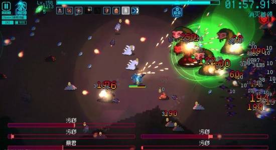 武器库拥有17+武器库存,55+武器插件和若干强化道具。武器插件可以提升武器的攻击速度、子弹大小和数量、附带攻击特效,甚至能直接改变武器的攻击模式,解锁全新的割草方式