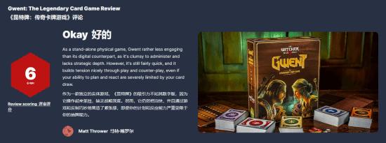 “昆特牌”是《巫师》系列中非常经典的卡牌游戏,CDPR官方后来将这一卡牌游戏单独发行成了《巫师之昆特牌》,并于近日在英国和美国等地发售了游戏的实体版卡牌。IGN今日给出了其实体版的评测报告,仅给出了6分的成绩。本文仅摘译总评部分如下:
