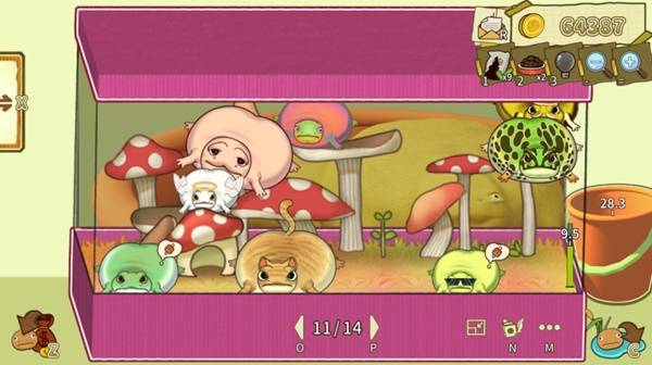游戏中你可以把抓到的丑蛙放进养殖缸,装饰环境、布置食盆、悉心照料,用各色染料将它们染成你喜欢的颜色。还可以把每只丑蛙都养得圆滚滚、肉嘟嘟,然后再高价卖掉。赚来的钱可以购买池塘和养殖缸的装饰物,以及更多的丑蛙幼苗。游戏中还贴心地加入了窗口挂机功能,可以把养殖缸缩小放置在窗口的一角,让这些丑萌的生物陪伴你的工作学习。至于丑蛙们卖去哪里、卖去干什么...就任君想象了。