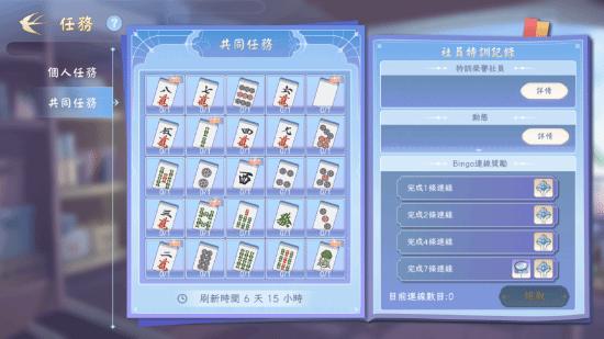 除了以上限时活动,社团系统亦开放新玩法。于新推出的「共同任务」中,所有同一社团的成员将共享任务进度,并可合力完成以宾果形式列出每週任务。任务中玩家需要使用指定的麻将牌胡牌以解锁宾果格,当宾果达成连线时将可获得丰厚的奖励。