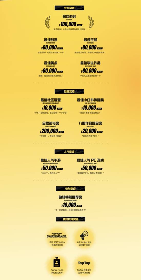 今年,TapTap聚光灯GameJam的赛事标准也全面升级,总奖金池高达150万元,共设立了最佳游戏、最佳创意、最佳人气等多个奖项,旨在让创作者在短暂时间内充分发挥自身优势,让小品作品的“长板”更加突出。