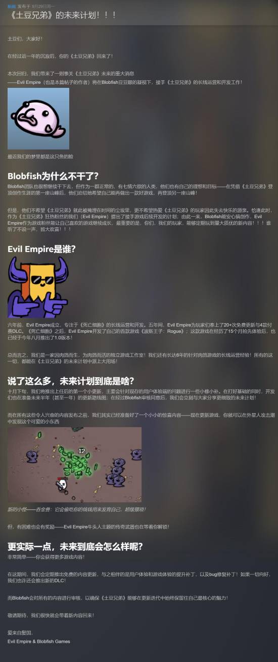 《波斯王子:rogue》及《死亡细胞》DLC开发商Evil Empire于今日宣布,工作室已正式接手《土豆兄弟》的长期运营及开发工作;游戏原开发商Blobfish Games将继续对相关内容进行监督与把关,但其工作重心将全面转向新作研发。