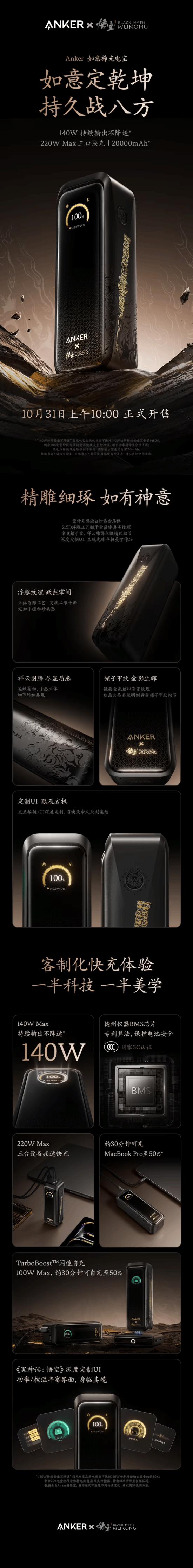 安克宣布推出与《黑神话:悟空》联名的“如意棒充电宝”,采用 2.5D 浮雕工艺 + 深度定制 UI,京东显示为 699 元,10 月 31 日上午 10:00 正式开售。