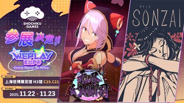 松竹游戏SHOCHIKU GAMES(松竹株式会社)宣布参展上海游戏展「WePlay Expo 2025」,活动将于11月22日到11月23日热闹登场!本次将在现场带来爽快连击肉鸽3D动作游戏“无尽幻樱阁”以及在中国完全初登场的新作,横向卷轴RPG“SONZAI:神在之地”。