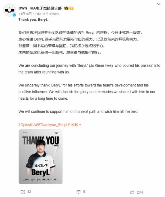 前一段时间,《英雄联盟》LCK战队DWG KIA官宣告别辅助选手BeryL。