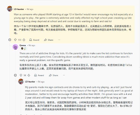除了一些常规的趣味调侃(比如有人调侃可以 “利用儿子去刷金币”),这个帖子还吸引了大量玩家讨论楼主让孩子接触 MMORPG 的决定,并非所有人都认为这是件好事。这些本身也是游戏粉丝的网友表示,《魔兽世界》的成瘾性极强,可能会对孩子的成长产生负面影响。
