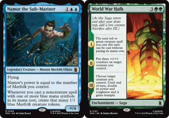 除此之外,万智牌丨漫威超级英雄还拥有一些独特的卡牌插画——受漫威经典故事中的某些经典时刻的启发而创作出来,以此致敬漫画的风貌和传承。从潜水人纳摩到浩克世界大战,每一张卡牌的设计都致敬了漫威宇宙的大胆画风、色彩与叙事方式。