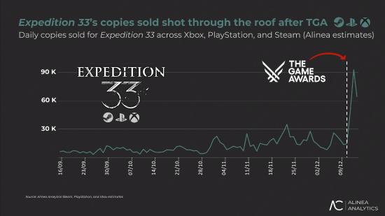 据Alinea Analytics数据分析显示,该作在TGA夺奖后,每日销量立即飙升至此前的6倍。颁奖礼结束后,游戏累计新增销量超20万套,总销量正式突破600万套大关。