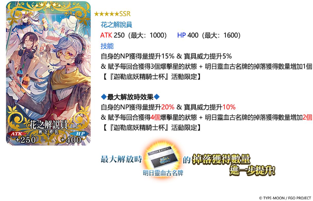 【以下內容皆來自廠商提供新聞稿資料】第一屆妖精騎士杯開幕,稱霸這場體育競技大賽吧!騎士「布里托瑪特」造訪迦勒底,決心透過展示自己的實力來侍奉失去國家的女王。在「明日靈血古圈」修練場內,騎士與各地英傑們展開了一場激烈的比拼,以徹底通關為目標,投身於這場體育競技大賽。第一屆妖精騎士杯,在此開幕!活動期間內,將會出現對戰多名從者的自由任務,分別有「第壹關口」、「第貳關口」及「第參關口」,隨著日程的推進,任務的種類會從「第壹關口」開始發生變化。而通關活動自由任務機率獲得的 3 種「摩根獎章」(金、銀、銅),皆可兌換提升「明日靈血古名牌」掉落獲得數量的活動限定概念禮裝「★5(SSR)花之解說員」。此外,挑戰逐日開放的超高難度展演任務,首次通關可以獲得「呼符」。