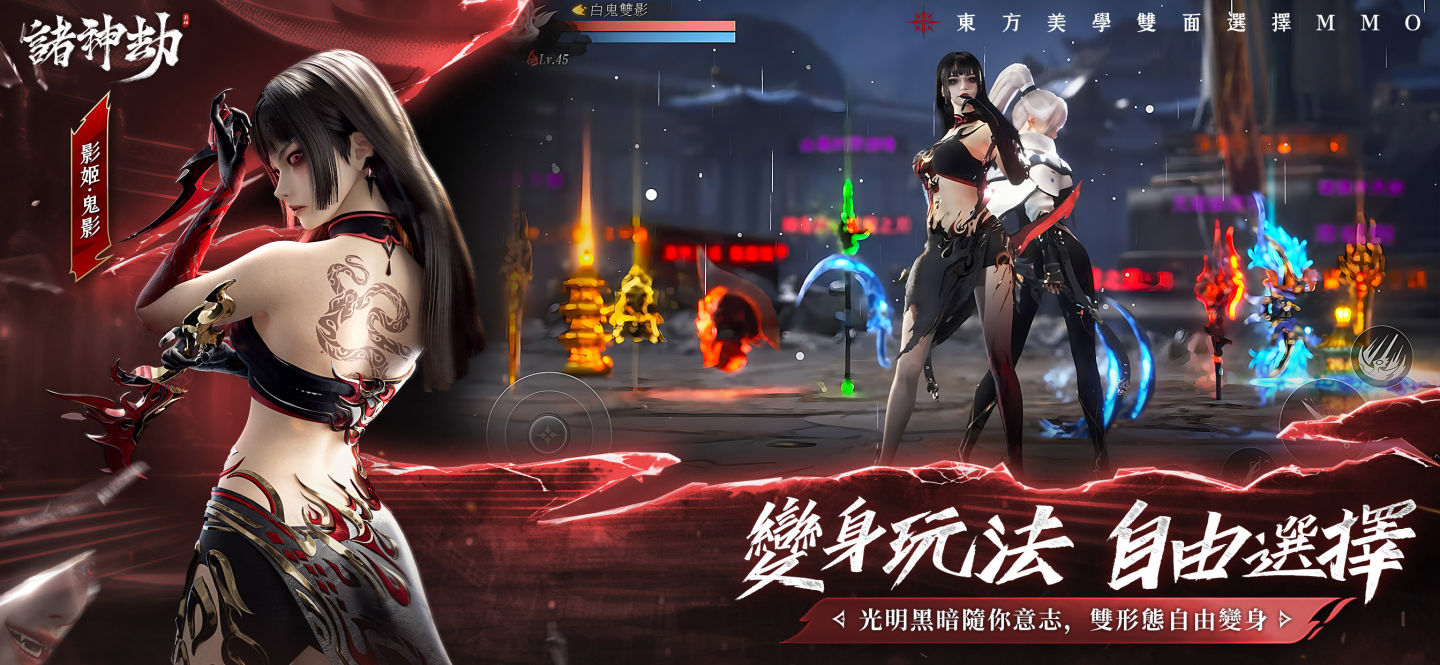 變身玩法,自由選擇!在遊戲中,玩家將一人飾演兩角,在探索廣闊的開放世界過程中,想成為溫柔美麗的「白影」,還是狂暴邪魅的「鬼影,是伺機待發在合適機會一招制勝,或是橫掃敵人正面突擊,雙重特點雙倍玩法,將由玩家自行選擇。