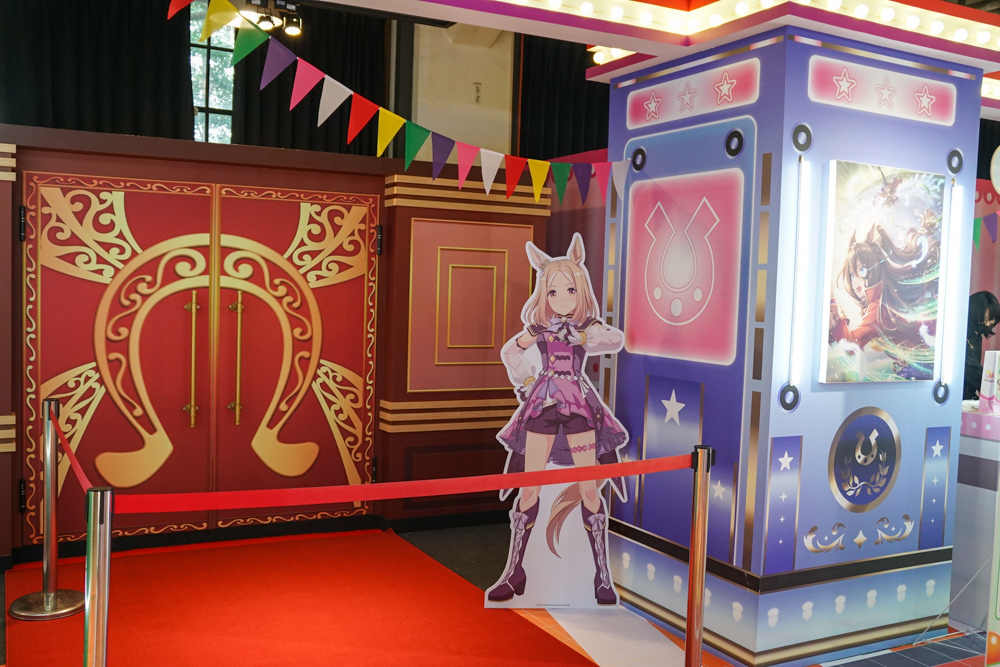 這次是以以「賽馬娘主題遊樂場」為主題,必備的 2.5 週年馬娘的立牌合影打卡點四處可見,整場更以《賽馬娘 Pretty Derby》遊戲元素設計的闖關活動與數種裝置,首先是本次將附帶感應裝置的「理事長室的金色大門」,當開啟金色大門時,將會隨機出現遊戲內登場的賽馬娘角色登場影片。