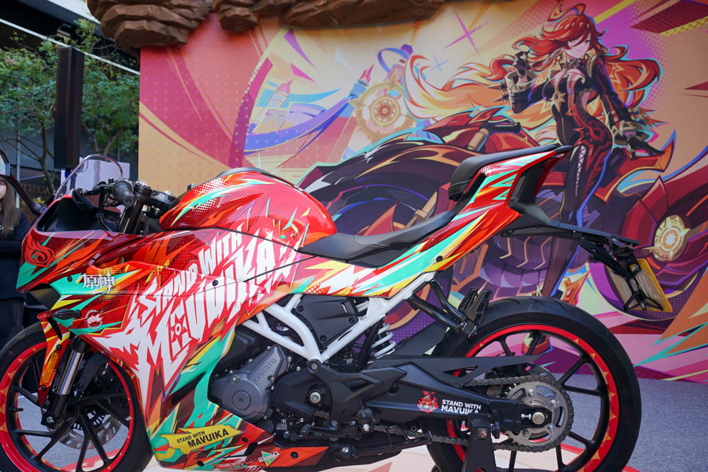 作為火系雙手劍的近戰角色強大戰力,在《原神》5.3版本中,五星火元素角色瑪薇卡的元素戰技可召喚一輛名為「馳輪車」的機車,供她騎乘進行戰鬥。機車的設計靈感源自納塔地區的文化,體現了該區的科技與傳統融合。在戰鬥中瑪薇卡騎乘馳輪車可提升移動速度,並強化攻擊範圍和傷害,為隊伍提供強大的火元素輸出,因此現場揭幕的則是「瑪薇卡主題彩繪重機」進行展出,並讓現場玩家合影留念。1 / 6