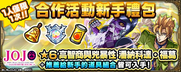 第 2 彈合作活動角色可以獸神化・改!第 2 彈合作活動角色「空條承太郎 SC」「花京院典明」「約翰・皮耶爾・波魯那雷夫」獸神化・改將於 1 月 11 日(六)12:00 解禁。合作活動新手禮包登場!還可獲得任選鈴等道具!購買「JOJO的奇妙冒險 黃金之風 合作活動新手禮包」,就能以運氣 5&等級「極」&「+值」MAX 狀態獲得「潘納科達・福葛(★6)」。此外,還能獲得任選鈴及體力罐等推薦給新手的道具組合!「潘納科達・福葛」只能透過合作活動新手禮包入手,每人限購 1 次!此外,可以入手第 1 彈合作活動的「喬斯達家族 徐倫&承太郎SO(★6)」(獸神化)的「JOJO的奇妙冒險 石之海 復刻合作活動新手禮包」,可以入手第 2 彈合作活動的「擁有崇高精神的狗 伊奇(★6)」(獸神化)的「JOJO的奇妙冒險 星塵遠征軍 復刻合作活動新手禮包」也會再度登場!販售期間:2025 年 1 月 11 日(六)12:00~2025 年 2 月 2 日(日)11:59