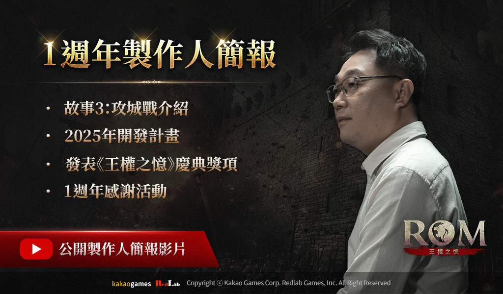 【以下內容皆來自廠商提供新聞稿資料】《ROM》於 2024 年 2 月開始全球正式營運後,不僅在臺灣、韓國地區達成應用程式商店人氣榜第 1 名,也分別在韓國、台灣 Google Play 營收排行榜獲得第 2 名、第 3 名,並在選出當年度優秀應用程式與遊戲的「Google Play 2024 年度最佳遊戲」中獲獎。為紀念全球營運正式上市 1 週年,此次製作人簡報製作為線上見面會影片,內容包含了 2025 年開發計畫、故事3:攻城戰世界觀影片、1 週年《王權之憶》慶典、1 週年紀錄影片、1 週年特別活動等等。 首先,RedLab Games 透過 2025 年開發計畫公開了故事3:攻城戰、新成長系統「裝備覺醒」、跨服地下城「精靈安息處」等 4 月為止的更新內容。之後將於今年內陸續公開「跨服爭奪戰」、「世界交易所」、「故事4:大君主戰」等內容。特別是首度公開的「故事3:攻城戰」世界觀影片,讓冒險家們可以窺探即將透過故事3 公開的攻城戰、轉職系統與新地區。此外,在「1 週年《王權之憶》慶典」公開了分別在各職業中戰鬥力、經驗值最優秀冒險家,並發放特別製作的「1 週年紀念金戒指」與「1 週年周邊套組」給獲獎者。同時,透過製作人簡報公開了回顧《ROM》與冒險家過去 1 年的紀錄的「2024 年 Review,History Movie」。另外,為紀念全球正式上市 1 週年,《ROM》也準備了多種活動。2 月 20 日起,《ROM》將舉行發放 5 種裝備復原卷軸、2 種造型/護衛者重新合成卷軸、1 種神聖的強化卷軸等豐富獎勵的 1 週年特別活動,以及發放「《ROM》1 週年紀念周邊」的官方粉絲頁活動。