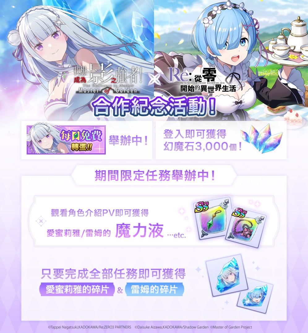聯動特別紀念活動2/3(四)維護後將舉辦聯動特別紀念活動,登入即可領取 3,000 幻魔石、活動期間內將限定任務全部完成還可獲得【冰之精靈術師】愛蜜莉雅、【萬能的鬼女僕】雷姆碎片、保證獲得 SS 角色轉蛋券等稀有素材和道具。並且觀看角色介紹 PV 還能夠獲得愛蜜莉雅、蕾姆製作專武所需要的魔力液!