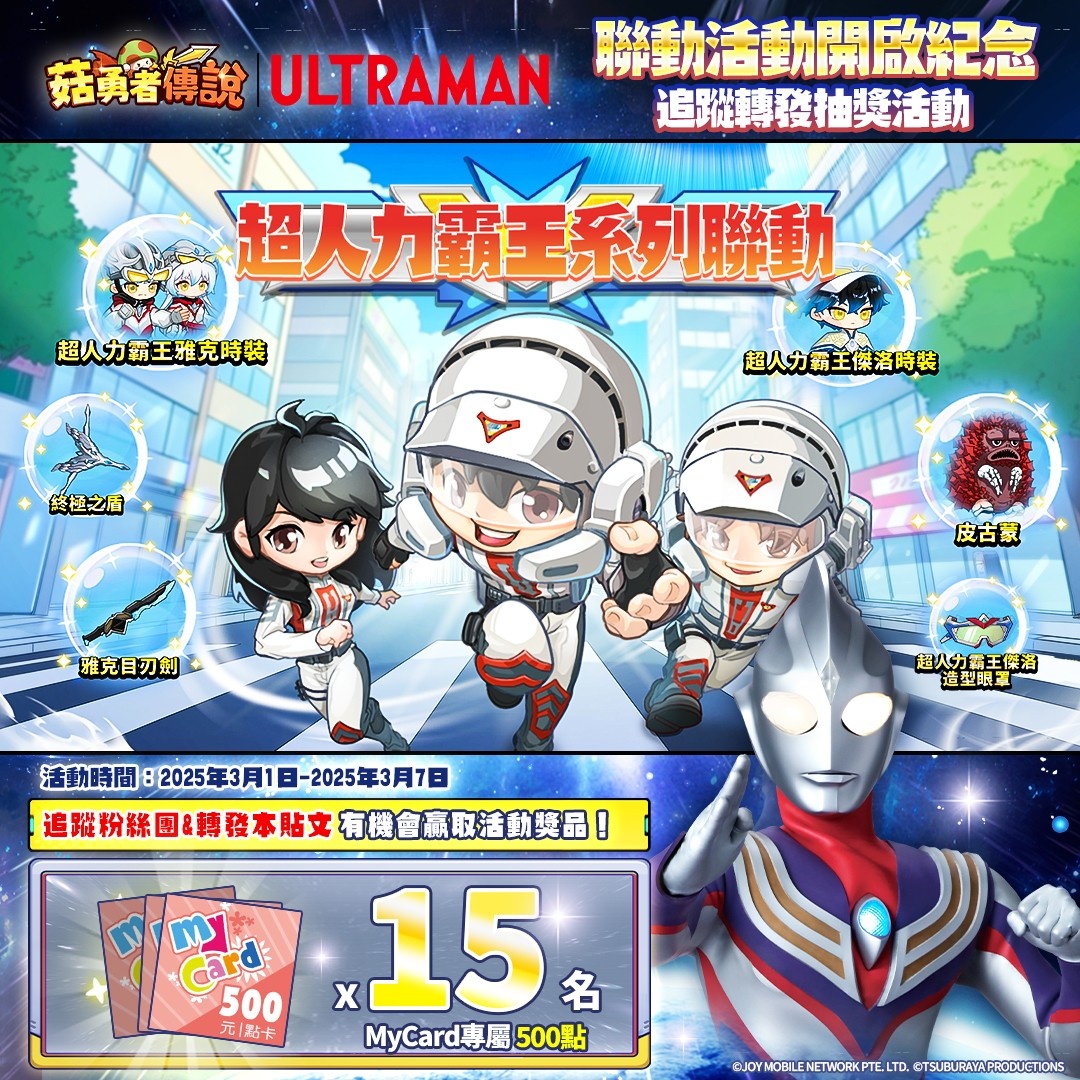 官方聯動紀念抽獎活動同步開啟!紀念《超人力霸王系列》×《菇勇者傳說》首次聯動正式開始,《菇勇者傳說》官方粉絲團即將於 3 月 1 日舉辦聯動抽獎活動!活動期間追蹤官方粉絲團,參與留言分享即有機會贏取 MyCard 幸運好禮!
