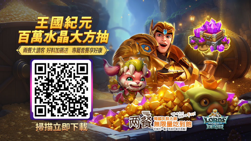 【以下內容皆來自廠商提供新聞稿資料】即日起到 3 月 31 日為止,只要前往全台「兩餐韓國年糕火鍋吃到飽」任一門市用餐,享用《王國紀元》專屬 2 人或 4 人套餐,除了好料加碼外,並贈送《王國紀元》虛寶卡 2 張或 4 張,即有機會獲得百萬水晶,同時門市現場掃描活動專用 QRCode,即可獲得《王國紀元》專屬新手禮包,總價值高達新台幣 6,000 元,限時發送,送完為止。